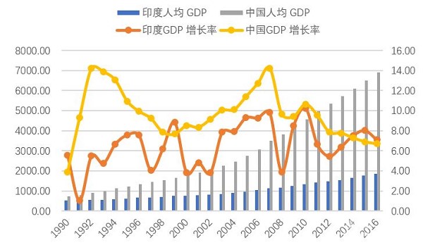 根据世界银行的统计数据显示,以2010年不变价美元计算,2016年中国GDP是9.51万亿美元,是印度2016年2.46万亿美元的近4倍。2016年中国人均GDP是6894美元,印度是1861美元,中国同样是印度的3.7倍。因此,我们首先可以看到的是印度的GDP无论在总量和还是人均都与中国有着较大的差距。