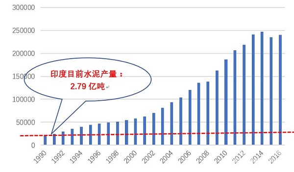 印度每一财年的起止时间和中国略有不同,印度完整一个财年是每年的四月份到第二年的三月份。印度2016-2017财年的水泥产量为2.79亿吨,中国2016年的水泥产量是24.03亿吨,简单直观的从量上来比较,中国目前的水泥产量是印度的8.6倍。从时间轴上来看,印度的水泥产量仅仅处在中国1991年到1992年的产量水平线上。虽然我们不能以此就得出结论说印度的经济水平还处于中国1992年的经济水平上,但是两国无论是在人口在国土面积,所经历的发展阶段都有相似性,从中我们还是可以看出印度和中国目前所处经济阶段的差异性。